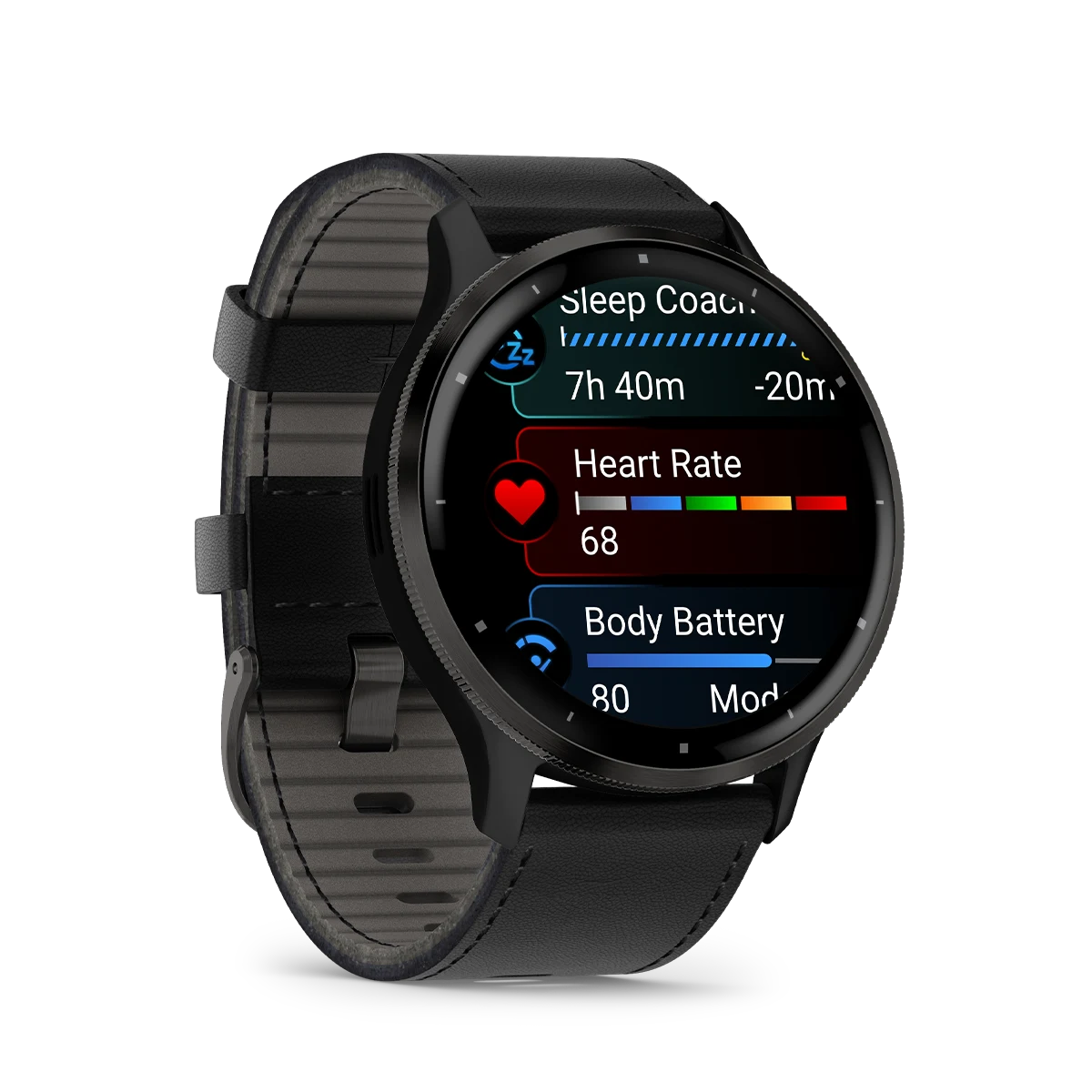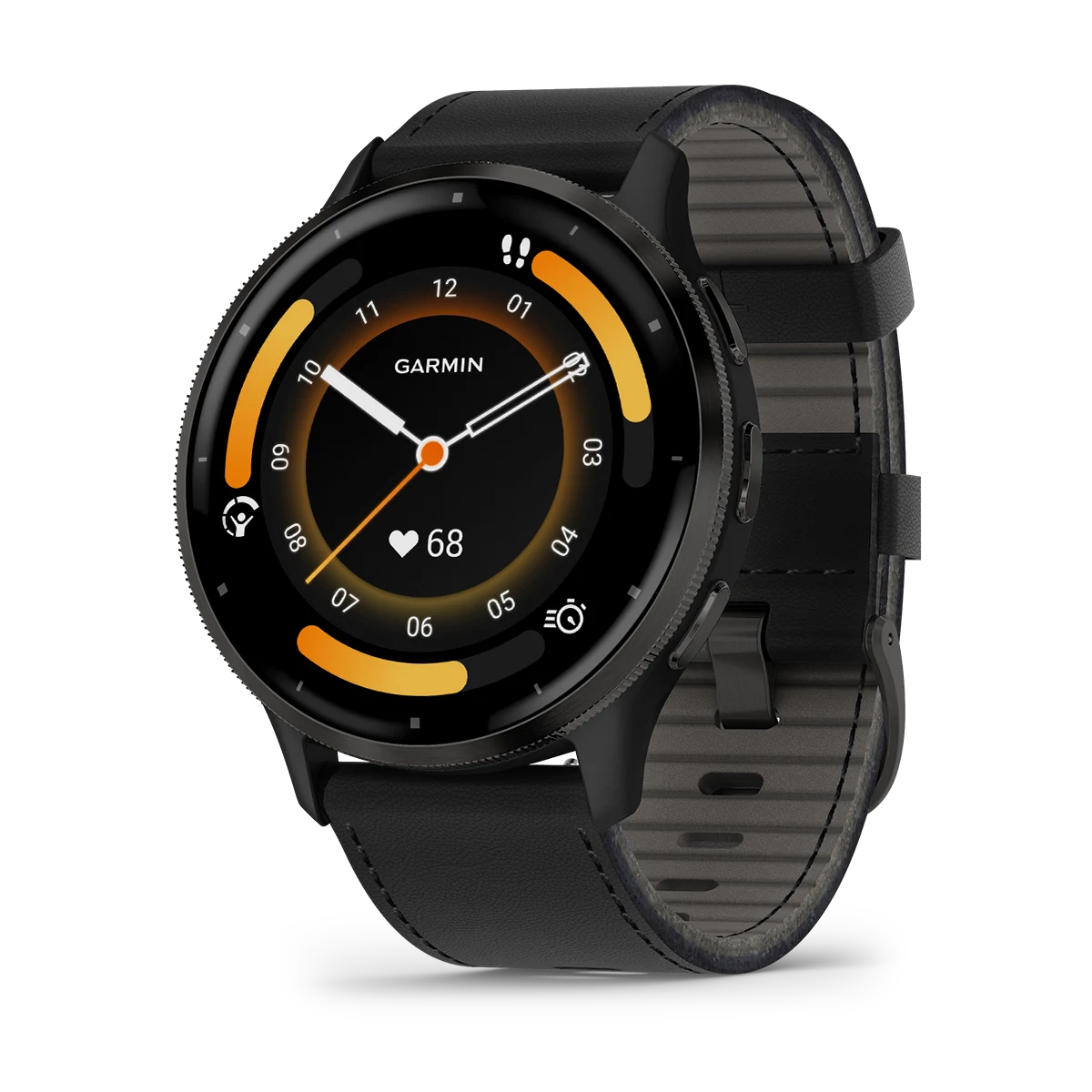 Garmin Venu® 3 Slate stainless steel bezel with black case and black leather band