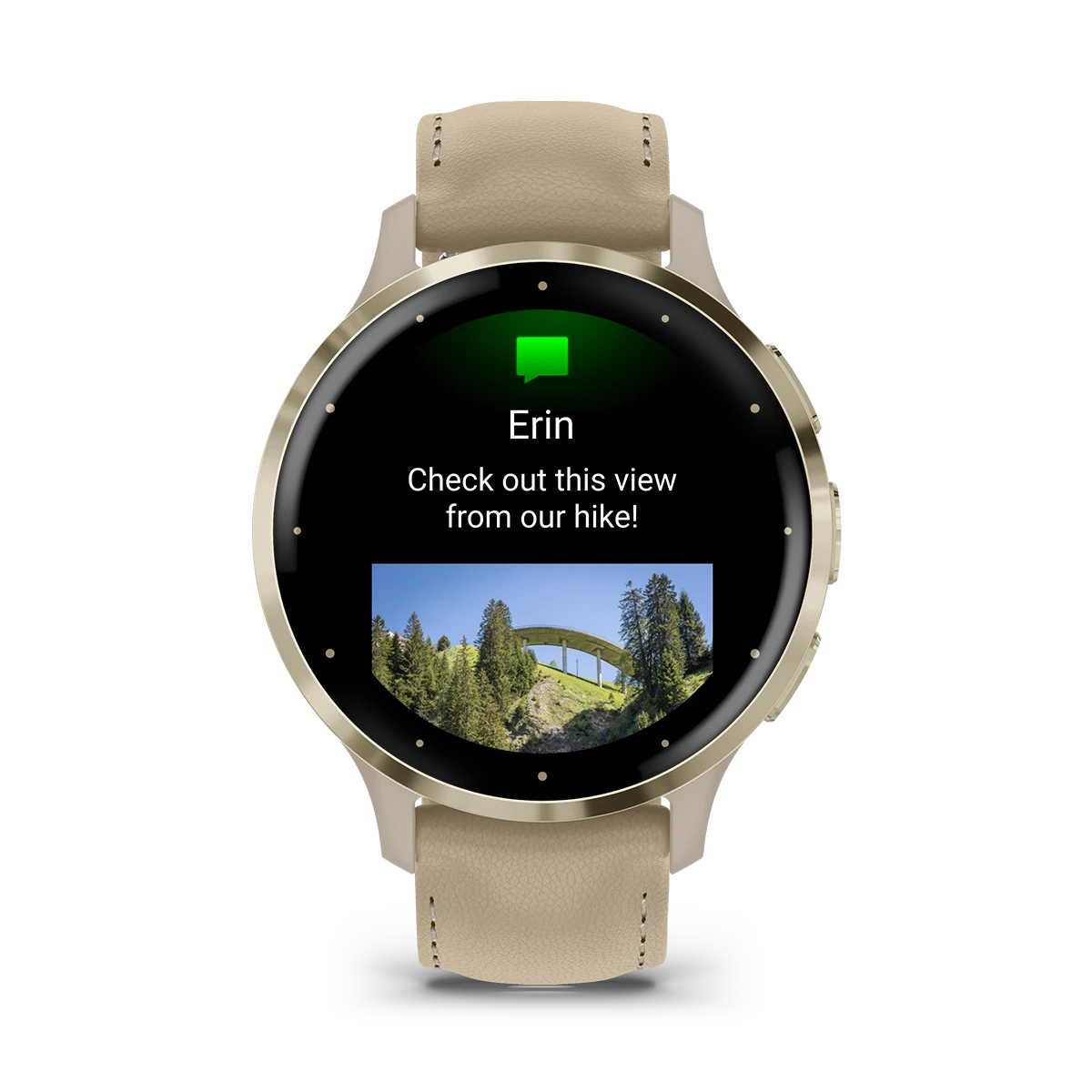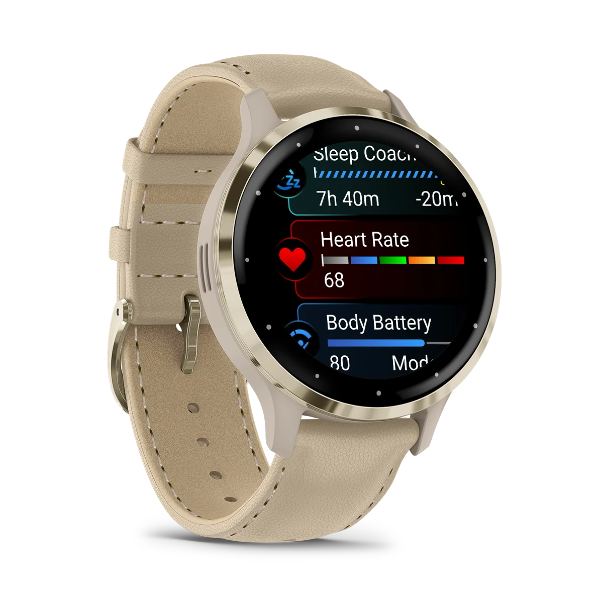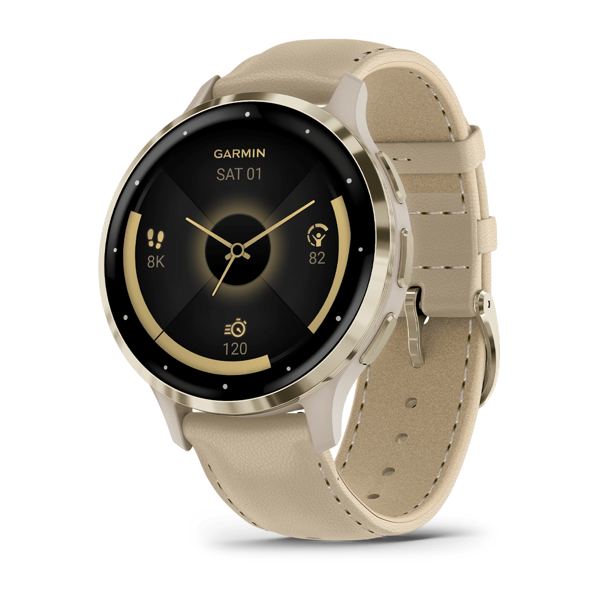 Garmin Venu® 3S Soft Gold Stainless Steel Bezel with French Gray Case and Leather Band